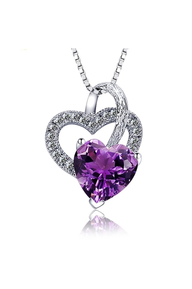 Gümüş Ametist Taşlı Çift Kalp Bayan Gümüş Kolye