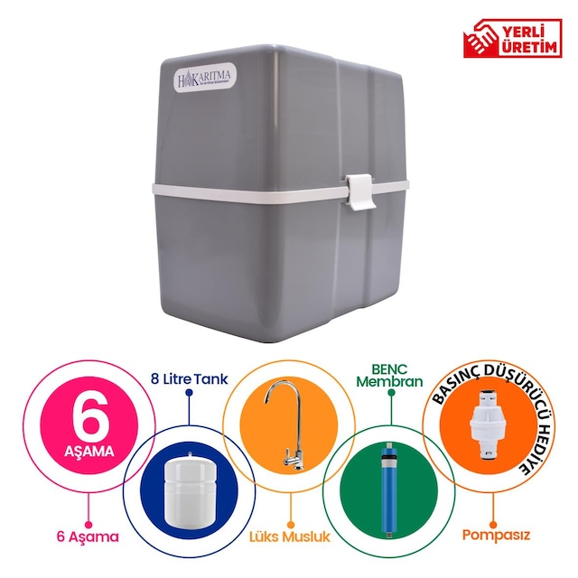 6 Aşamalı Bench Membran 8 Lt Çelik Tank Pompasız Su Arıtma Cihazı