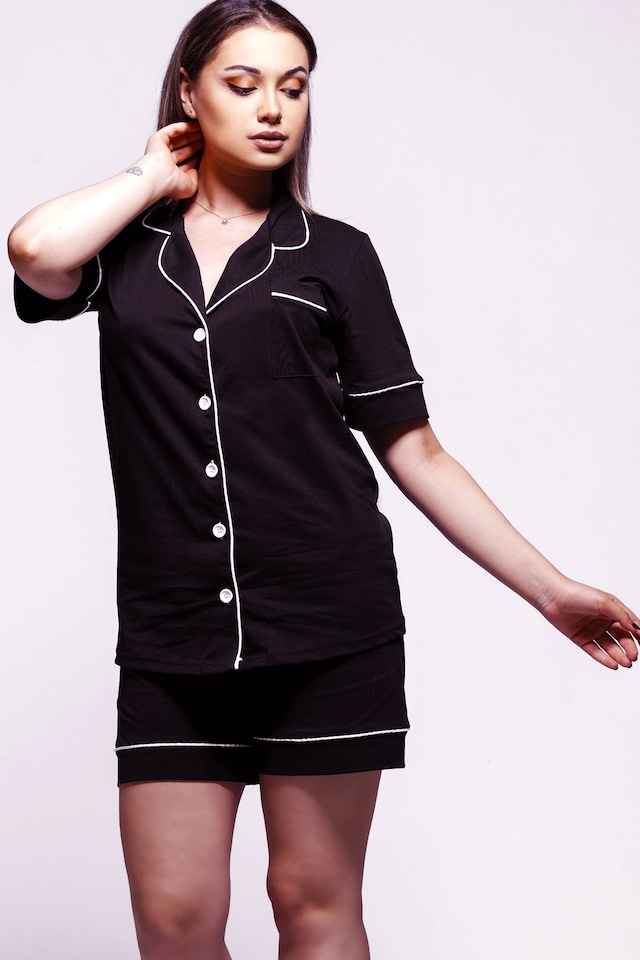 Kadın Düğmeli Pijama Şortlu Düğmeli Siyah Takım