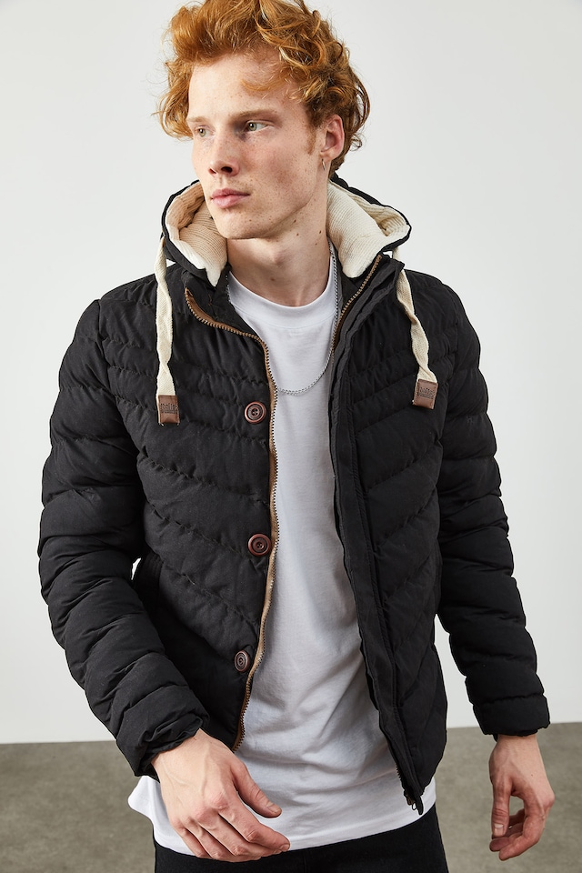 XHAN Siyah Kapüşonlu Şişme Mont 0YXE4-44076-02