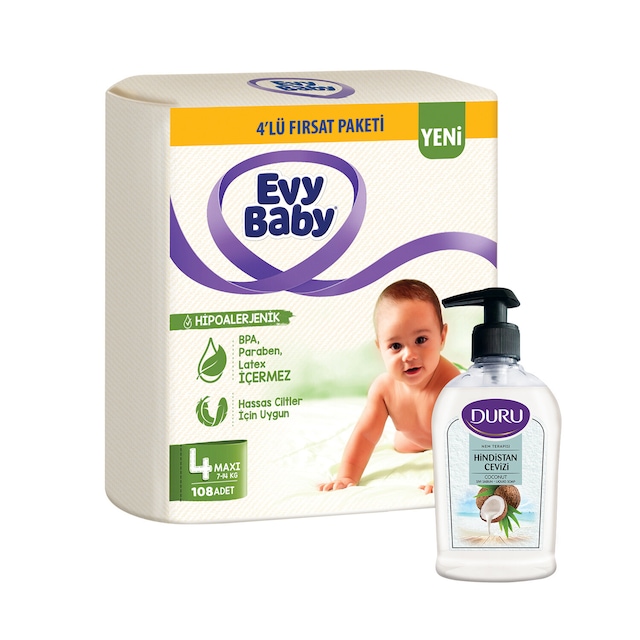 Evy Baby Bebek Bezi 4 Numara Maxi 4'lü Fırsat Paketi 108 Adet + Duru Sıvı Sabun ürünü için anahtar kelimeler: