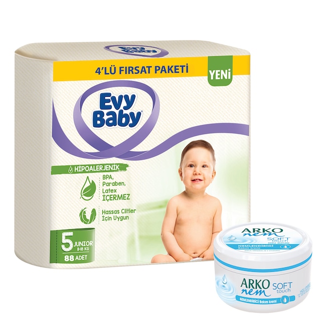 Evy Baby Bebek Bezi 5 Numara Junior 4'lü Fırsat Paketi 88 Adet + Arko Soft Touch Krem ürünü için anahtar kelimeler: