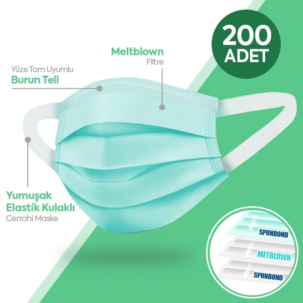 Happy Yumuşak Elastik Kulaklı 3 Katlı Telli Yeşil Maske 200 lü ürünü için anahtar kelimeler: