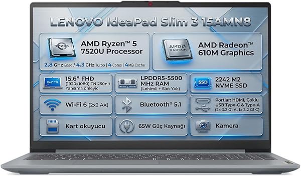 Lenovo IdeaPad Slim 3 15AMN8 | AMD Ryzen 5 7520U | Integrated AMD Radeon 610M Graphics | 15.6" FHD (1920x1080) TN 250nits | 8 ürünü için anahtar kelimeler: