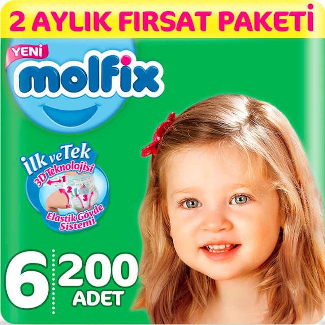 Molfix 3D 2 Aylık Fırsat Paketi Bebek Bezi 15+ KG 6 Beden 200 Adet ürünü için anahtar kelimeler: