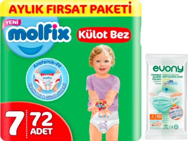 Molfix Külot Bez 7 Beden XX Large Aylık Fırsat Paketi 72 Adet + Evony Maske 10'lu Hediyeli isimli ürünü internet den online olarak 127.99 - 189.00 fiyat aralığında temin edebilirsiniz.