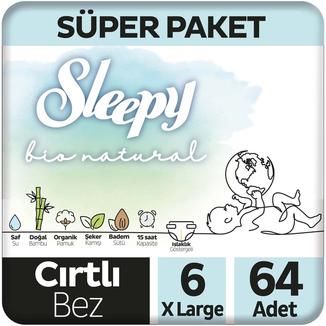 Sleepy Bio Natural Bebek Bezi 6 Numara XLarge Süper Paket 64 Adet ürünü için anahtar kelimeler: