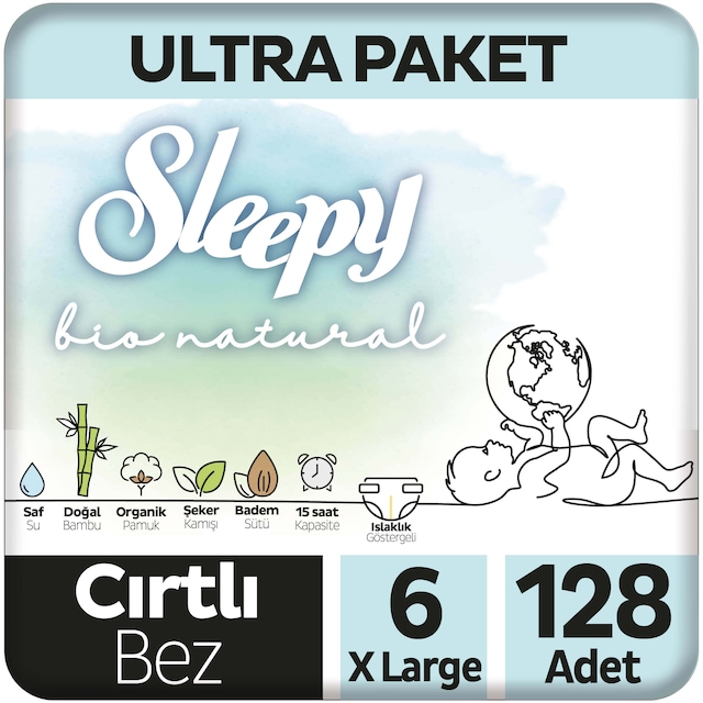 Sleepy Bio Natural Bebek Bezi 6 Numara XLarge Ultra Paket 128 Adet ürünü için anahtar kelimeler: