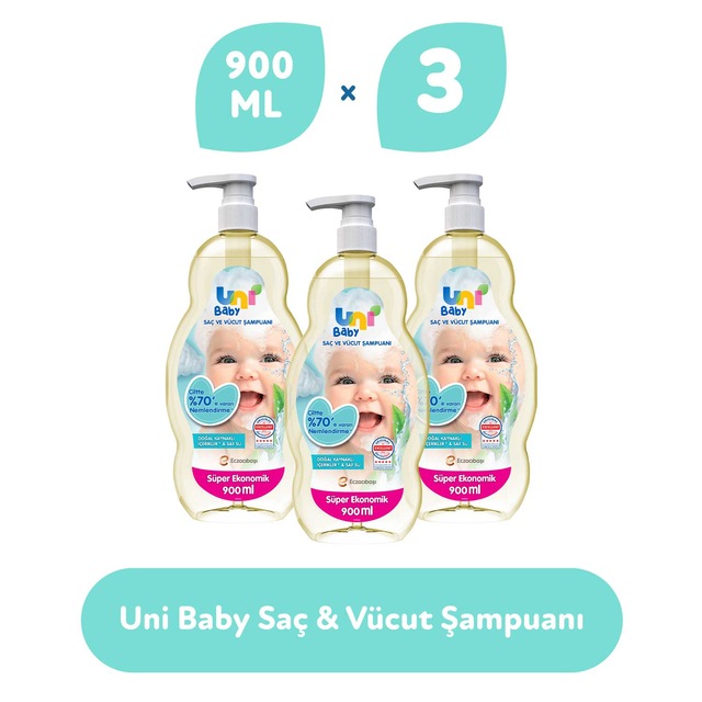 Uni Baby Bebek Saç ve Vücut Şampuanı 3 x 900 ML ürünü için anahtar kelimeler: