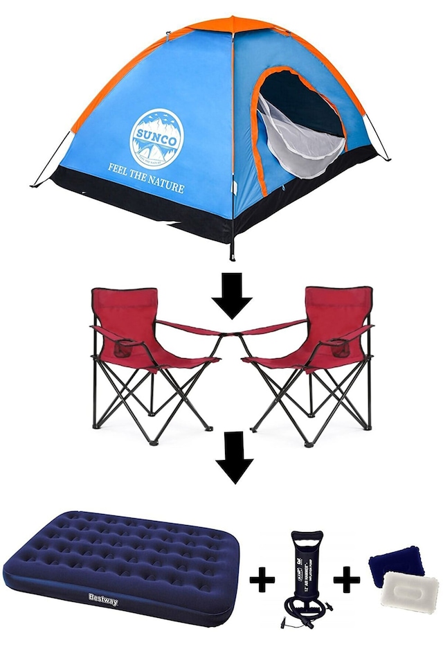 Walke Kırmızı Lüks Kamp Seti 4 Kişilik Çadır + Çift Kişilik Yatak + 2 Sandalye + Pompa + 2 Yastık ürünü için anahtar kelimeler:
